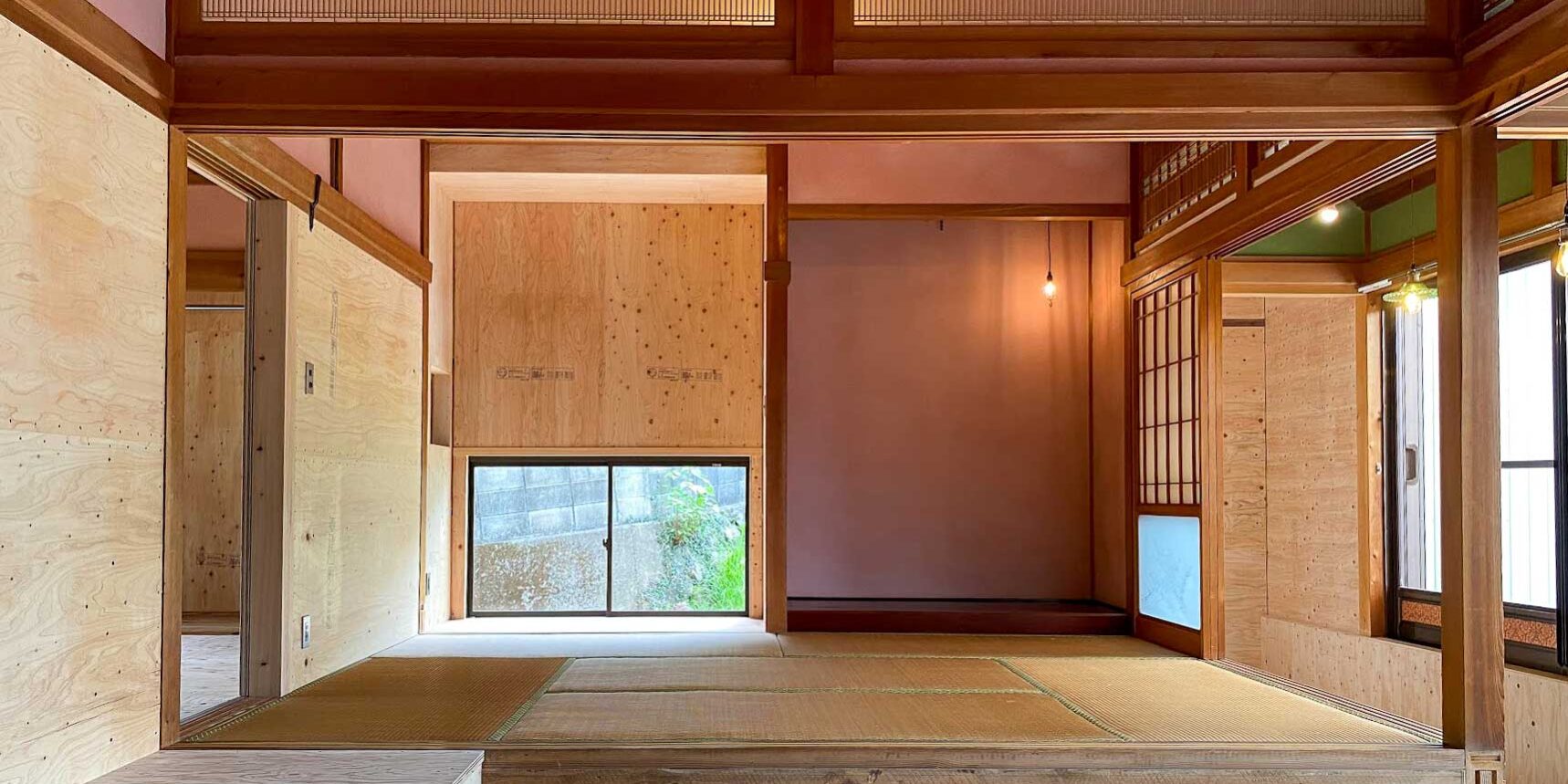 空き家になった古民家を、若い夫婦二人が暮らす場所として耐震補強工事とリノベーション工事を行いました。風呂やトイレなどの水回り設備を新しく入れ替え、玄関に広い土間を作りました。和室の天井を一部撤去し、障子や襖などの建具を取り払うことで大空間が広がります。外壁の漆喰補修は施主自らが修復されました。内壁の漆喰も現状の色を楽しんだ後、新しい色に塗り直すことができます。畑で野菜を作ったり、古い小道具や雑貨を飾ったりしながら、これから始まる古民家暮らしを楽しみにしておられます。