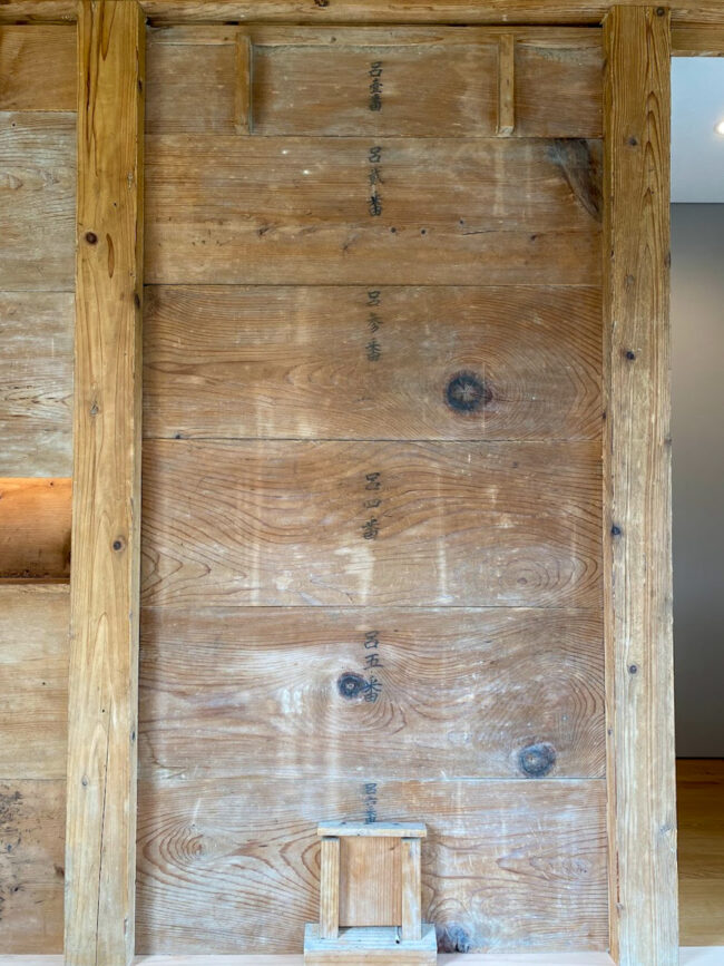 古い穀増「コクマス」(米の貯蔵庫)の板壁を再利用しました 「コクマス」とは、農家で古くから使用されている、米を保存するための倉庫のことをいいます地域の気候や土地の特性に合わせて、壁や柱には地域によって異なる木材が使用され…